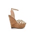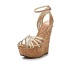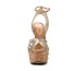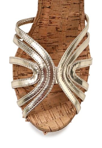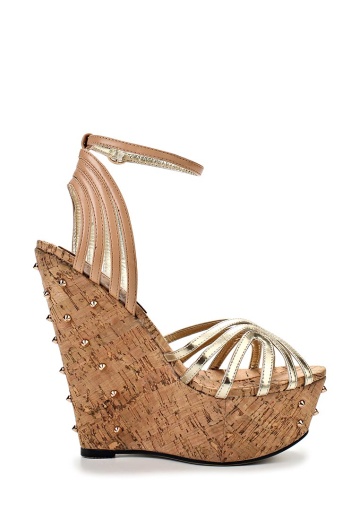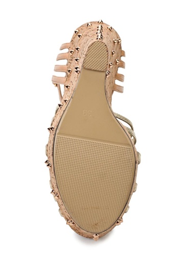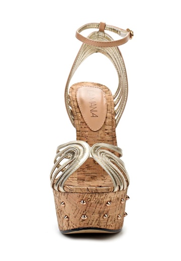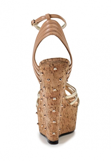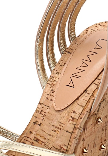 Стильные босоножки Lamania выполнены из искусственной кожи бежевого и золотистого цветов. Детали: ремешок на щиколотке, танкетка с пробковой фактурой декорирована золотистыми шипами.